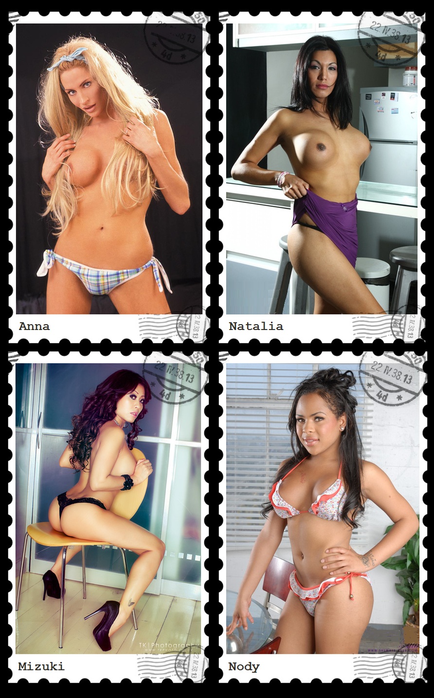 Here we are. The second bonus beauty week of the year. Good looking group dont you think? Shame these weren't real stamps. No doubt I'm sure they'd be popular to those who use them or collect them. Mizuki in the lower left corner is a GG...yep not a tgirl. I always provide one GG to show how they pair up with the others.